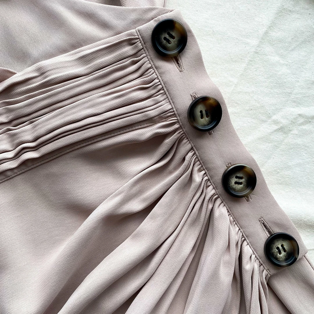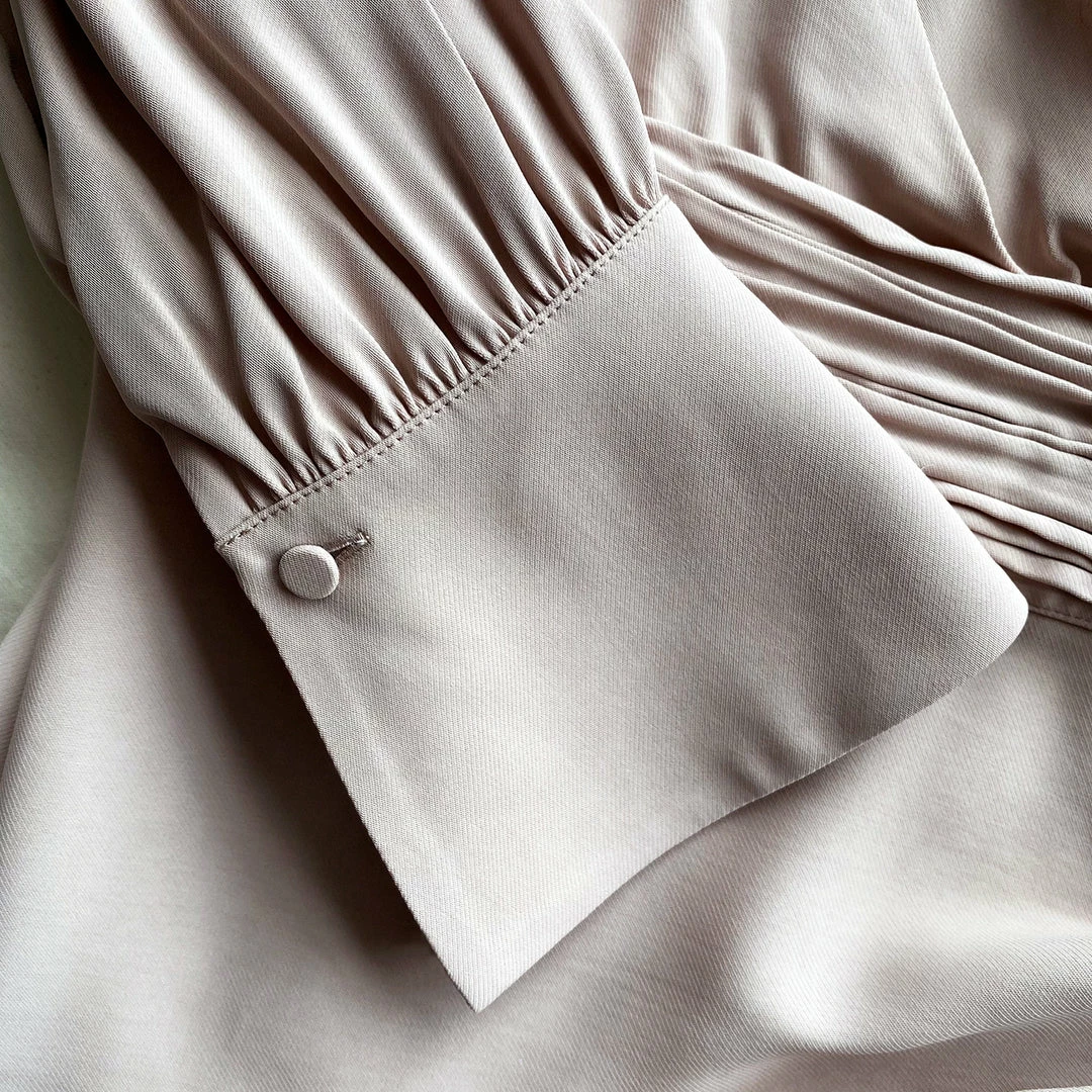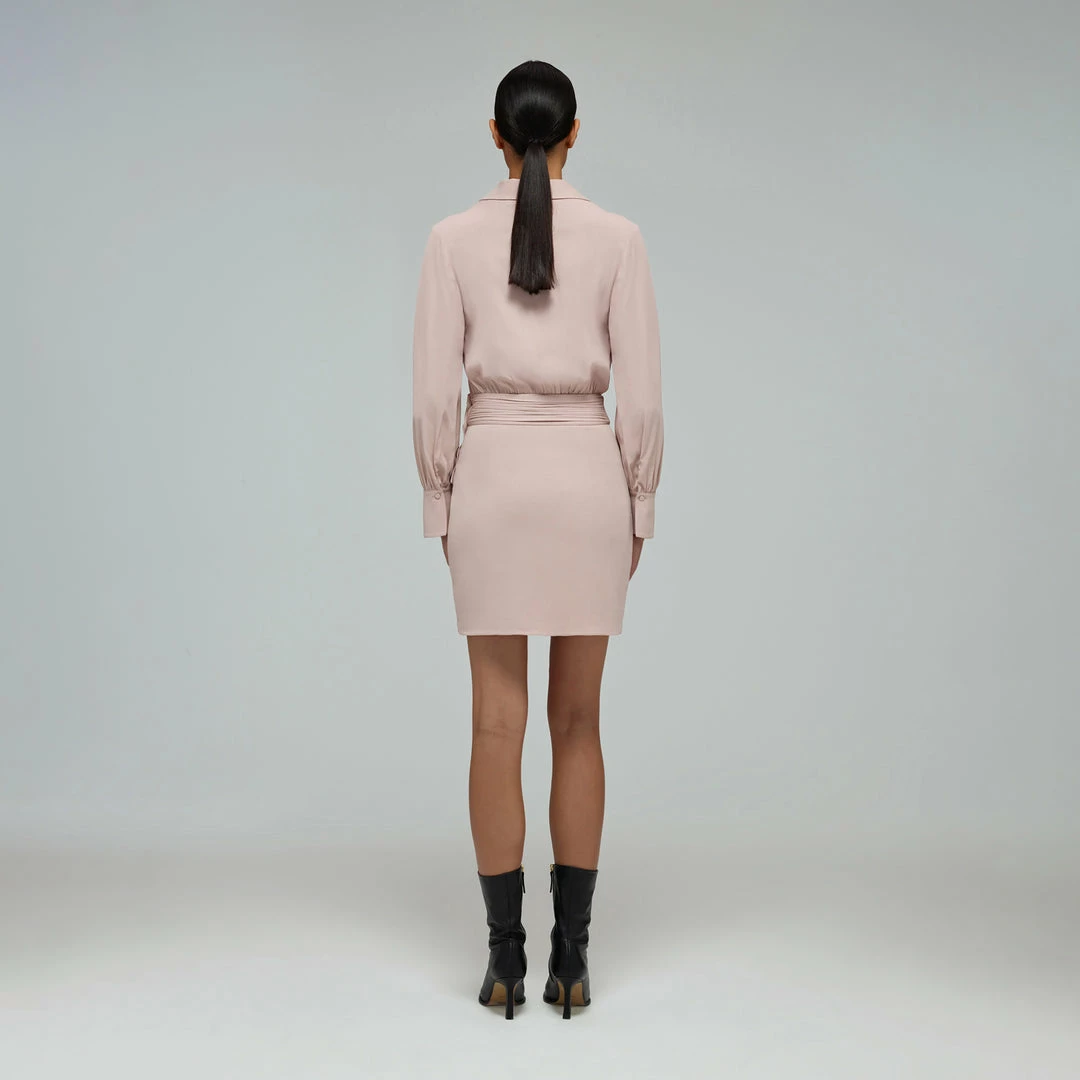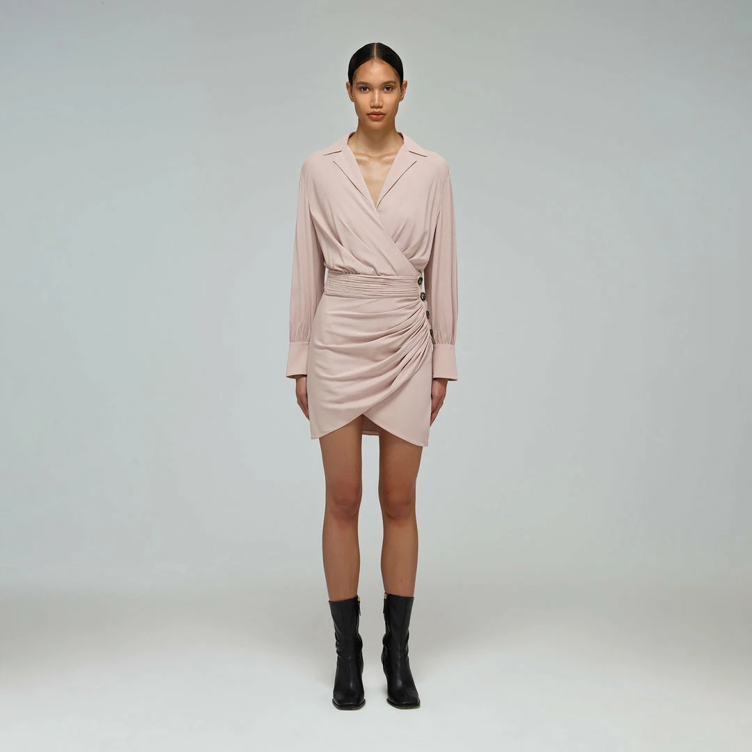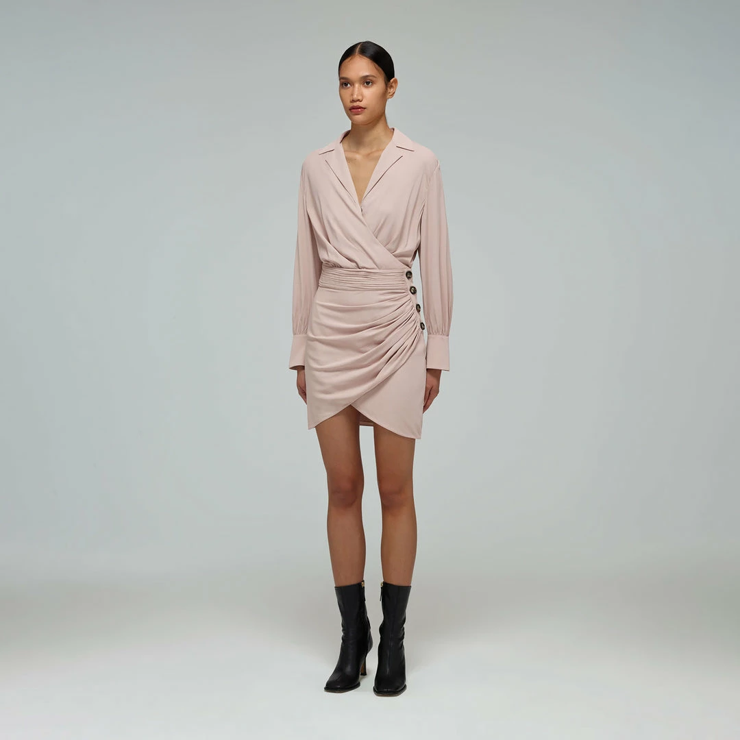 This mini dress is cut from taupe stretch crepe. It is designed with a shirt collar and wrap front. The drapey skirt has a side split and is finished with button detailing. Check the Size Guide to find your perfect fit.