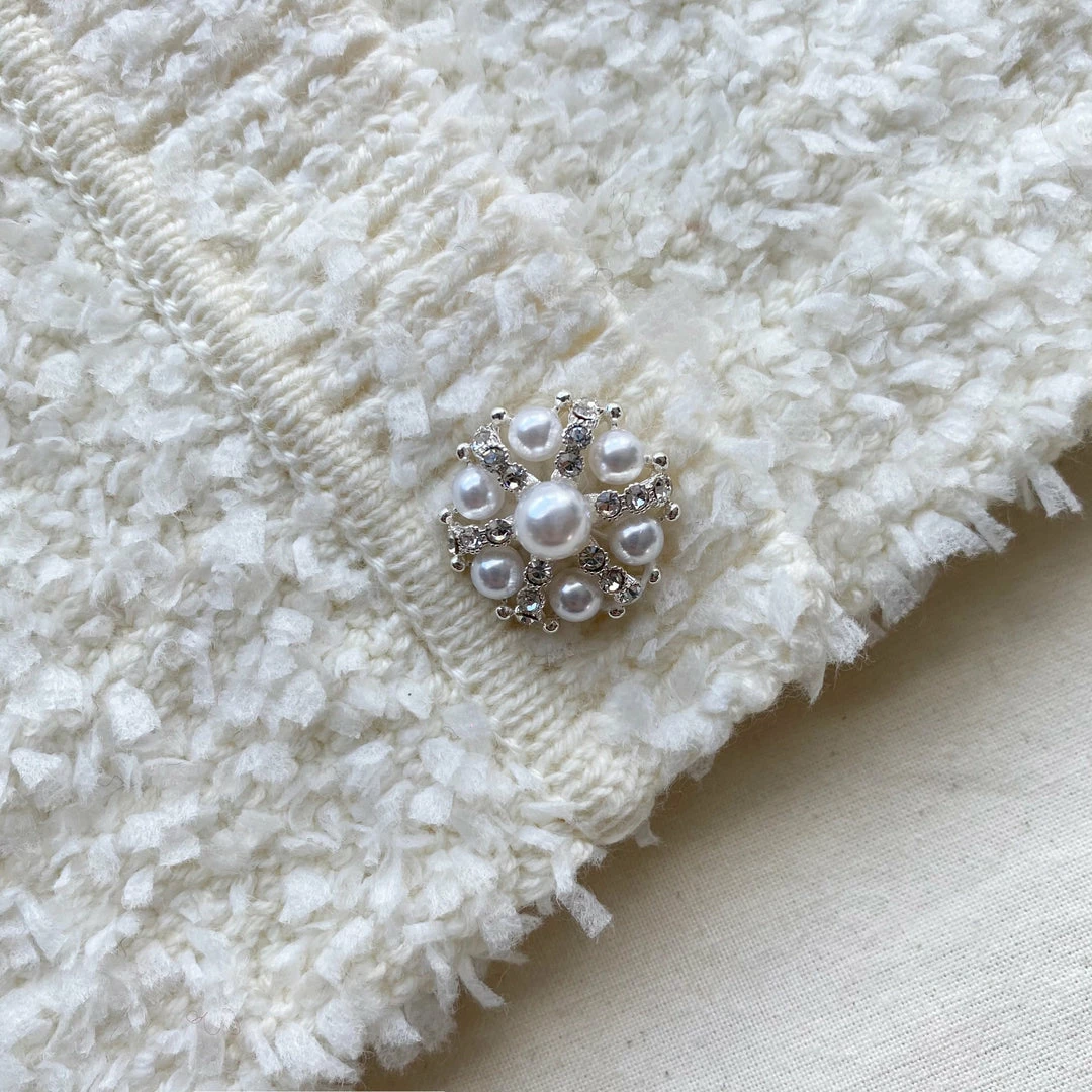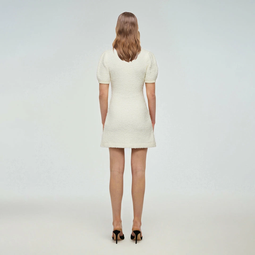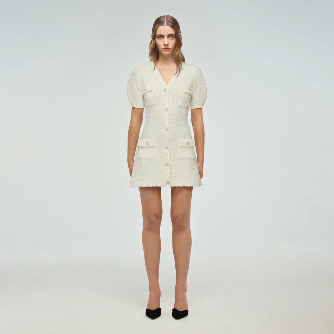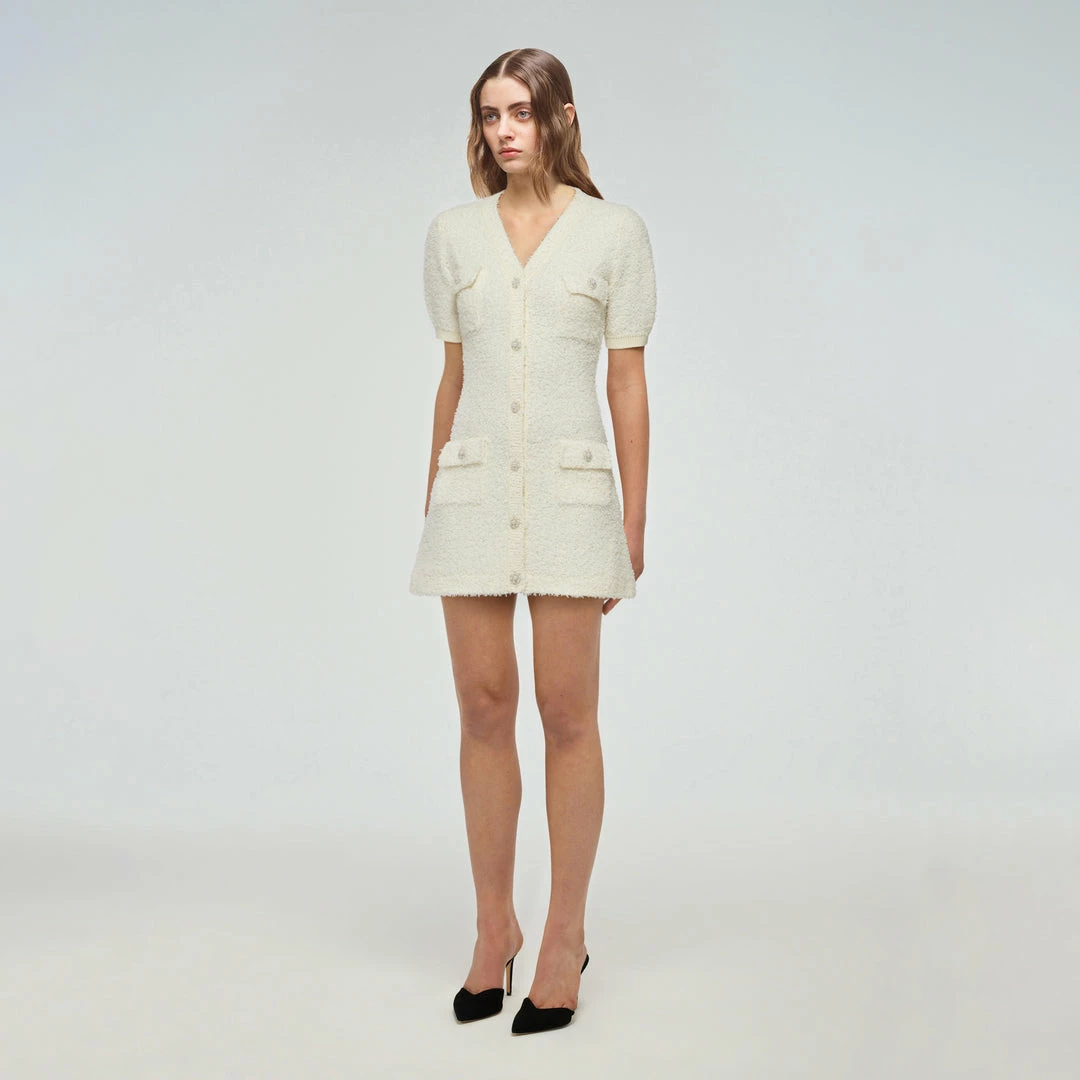 This ivory short sleve tape knit mini dress is designed with pocket details finished with pearl buttons. It is loosely fitted to the body and falls to a flared silhouette. Check the Size Guide to find your perfect fit.