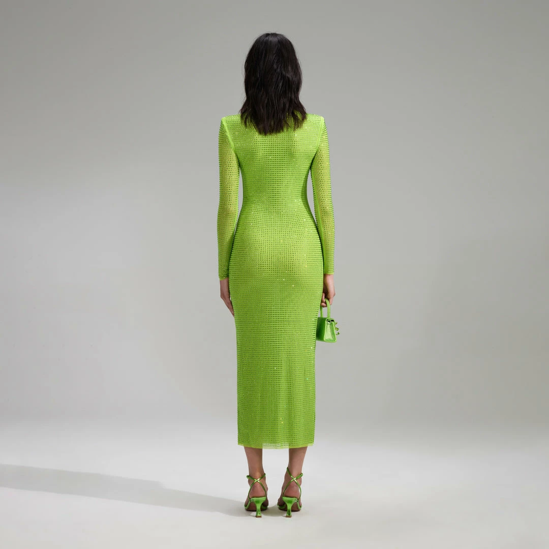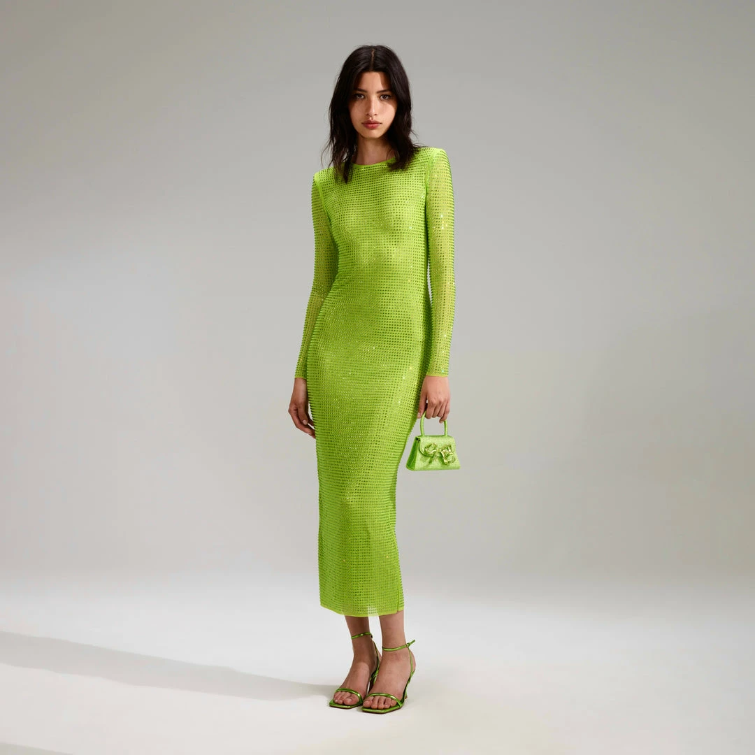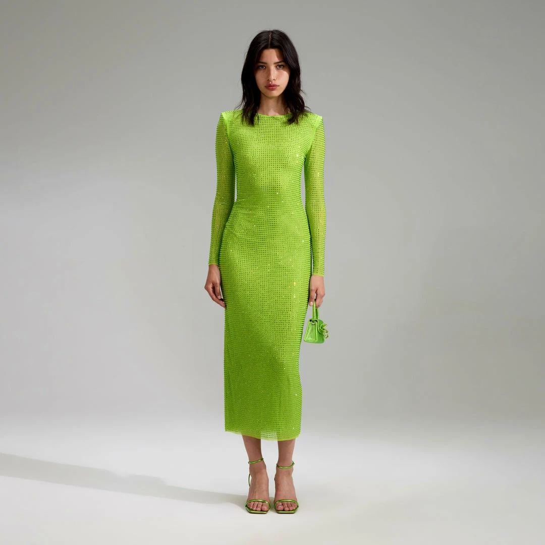 Turn heads in this high-shine number, presented in an eye-catching shade of lime-green overlaid with sequins. With a stretch fit that hugs the figure in all the right places, the midi length and long sleeves keep the silhouette looking sophisticated. Slick your hair back and pair it with stilettos for an extra dose of glamour.