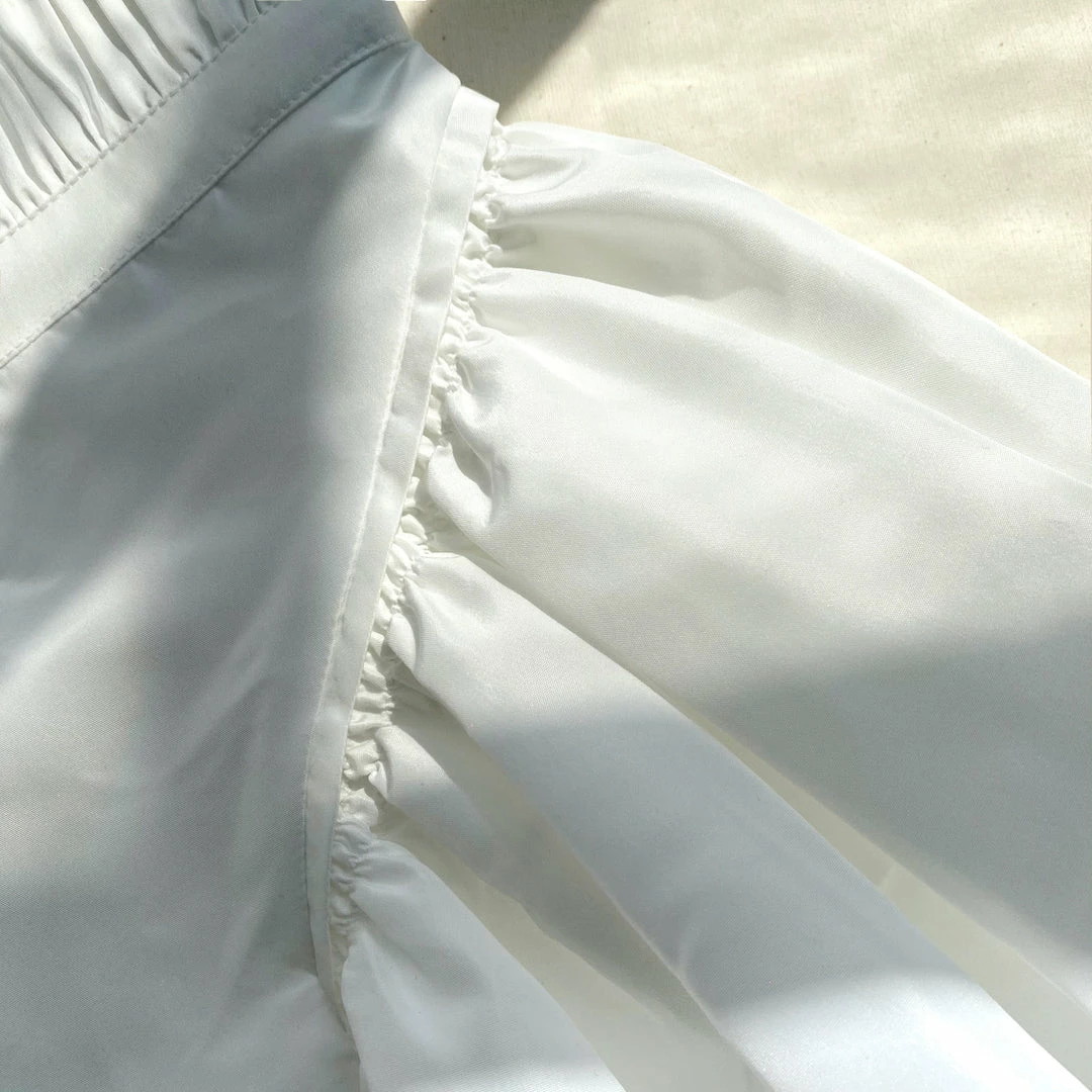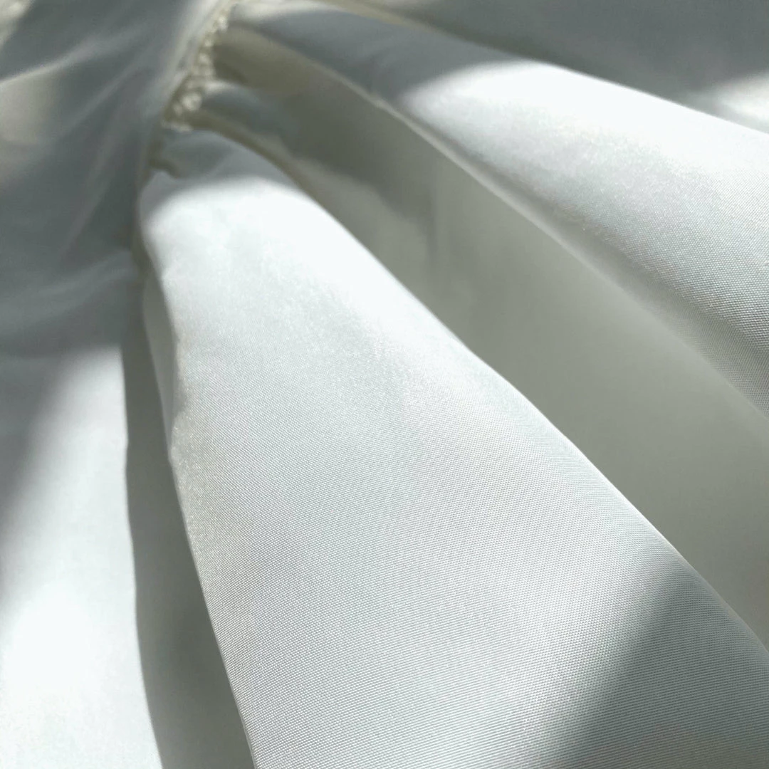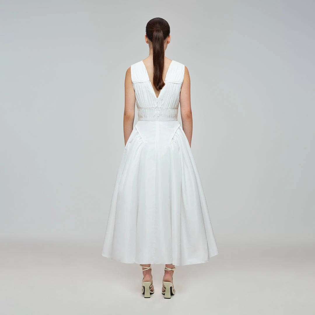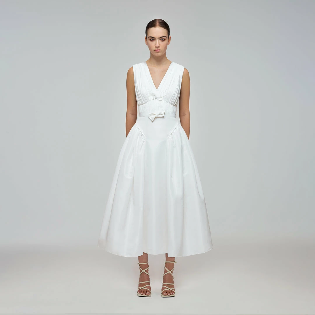 This white taffeta midi dress features a double bow detail at the front bodice. The skirt is ruched at the side panels to create a full silhouette. Check the Size Guide to find your perfect fit.