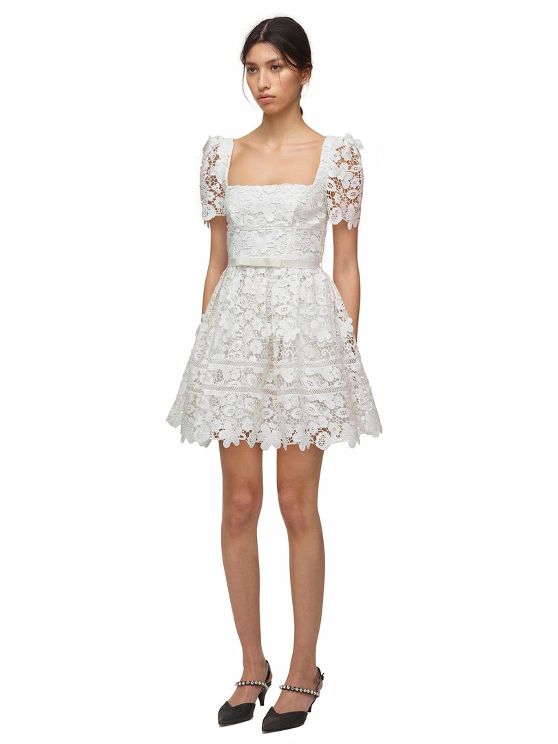 This dress is cut from white guipure floral lace. The dress is designed with a fitted bodice, removable tonal grosgrain bow belt and falls to a full mini skirt. This style is lined. Check the Size Guide to find your perfect fit.