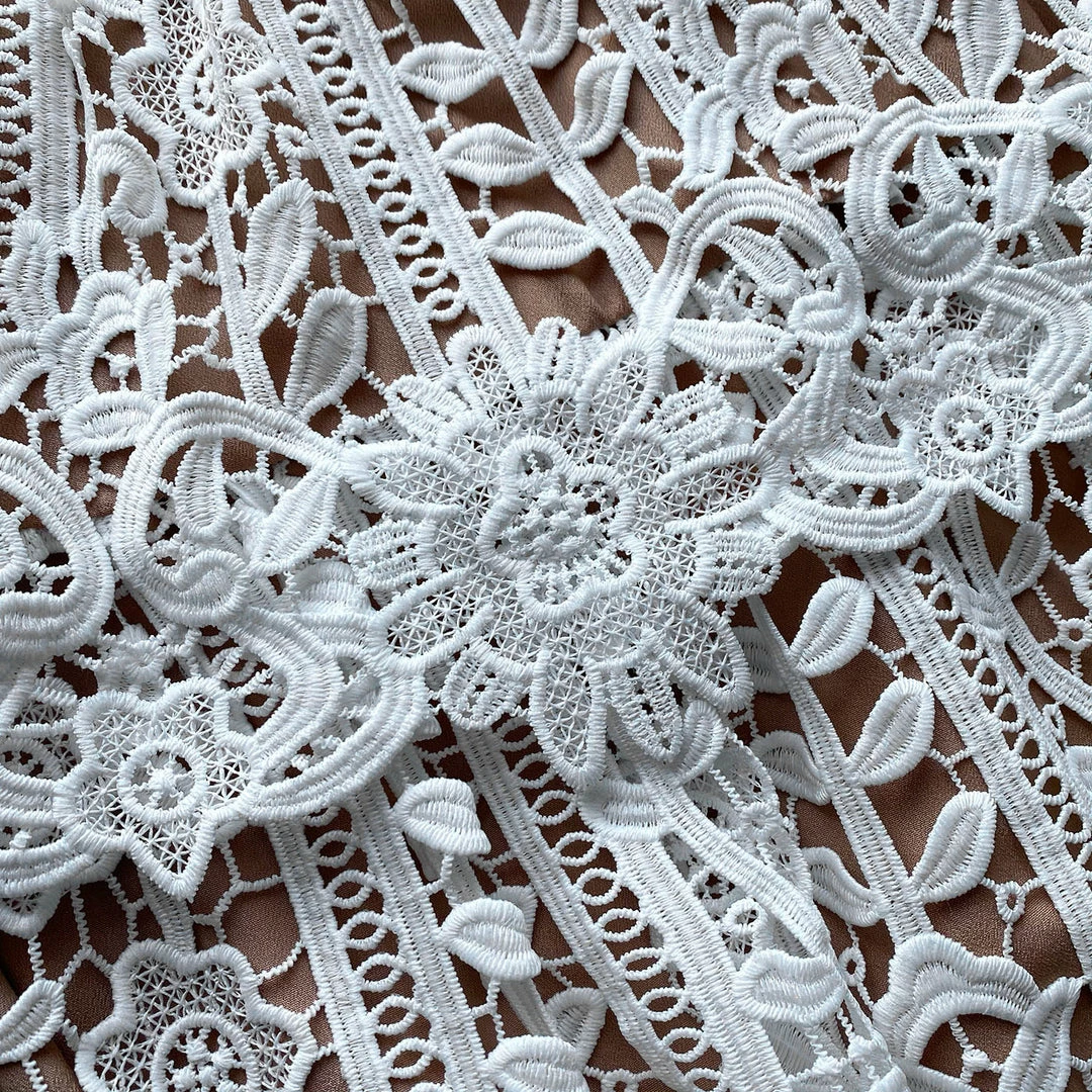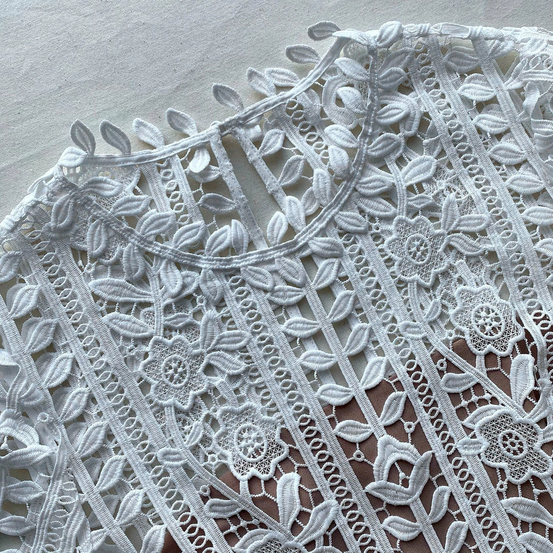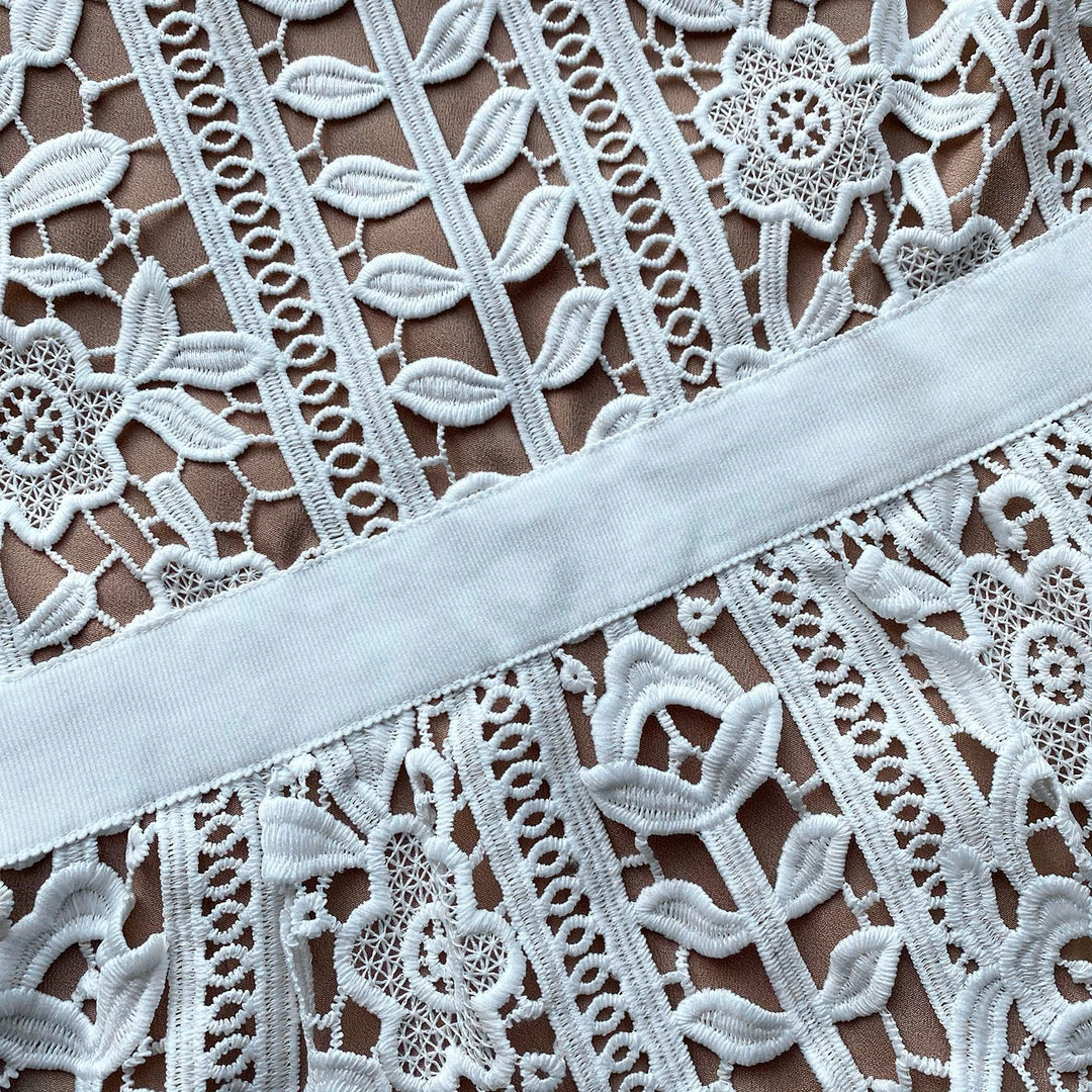 This white midi dress is cut from floral guipure lace. It is fitted through the waist with an elasticated grosgrain waistband and features a peplum hem. The skirt falls to a flared silhouette and finishes on a scalloped edge. Check the Size Guide to find your perfect fit.
