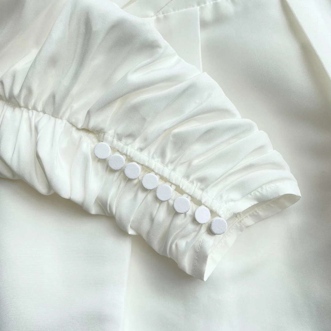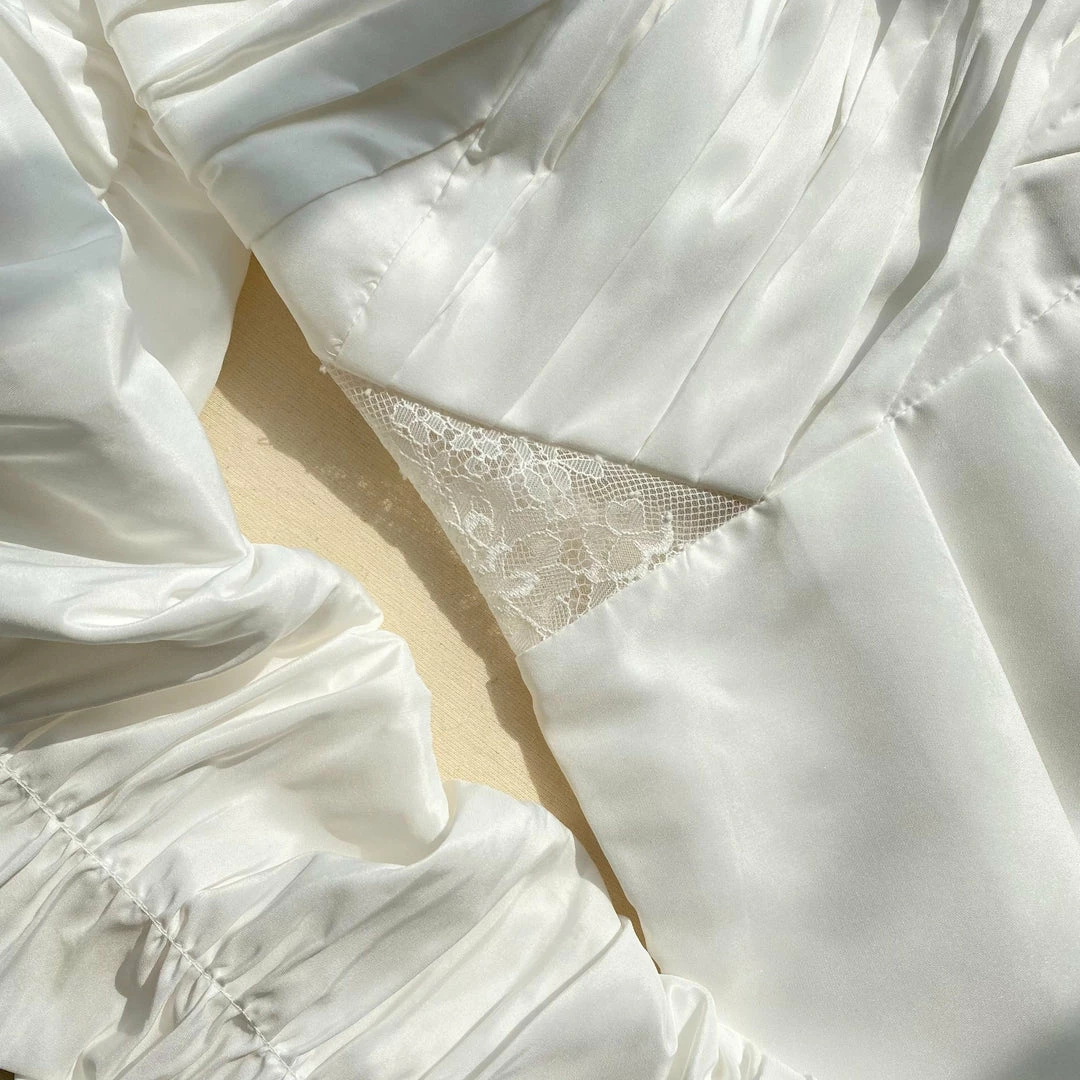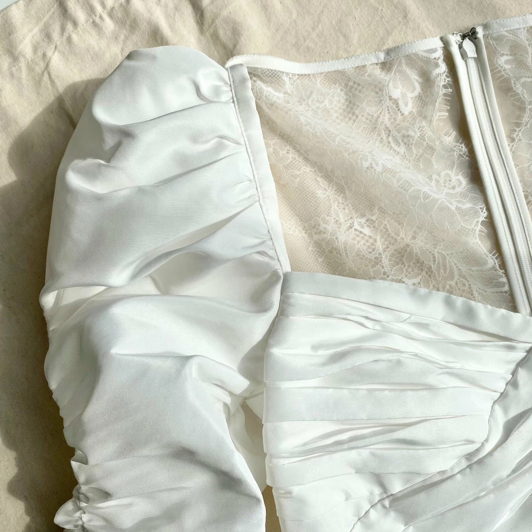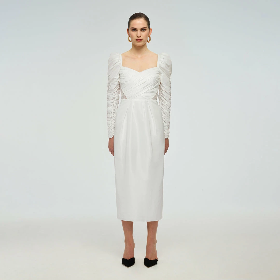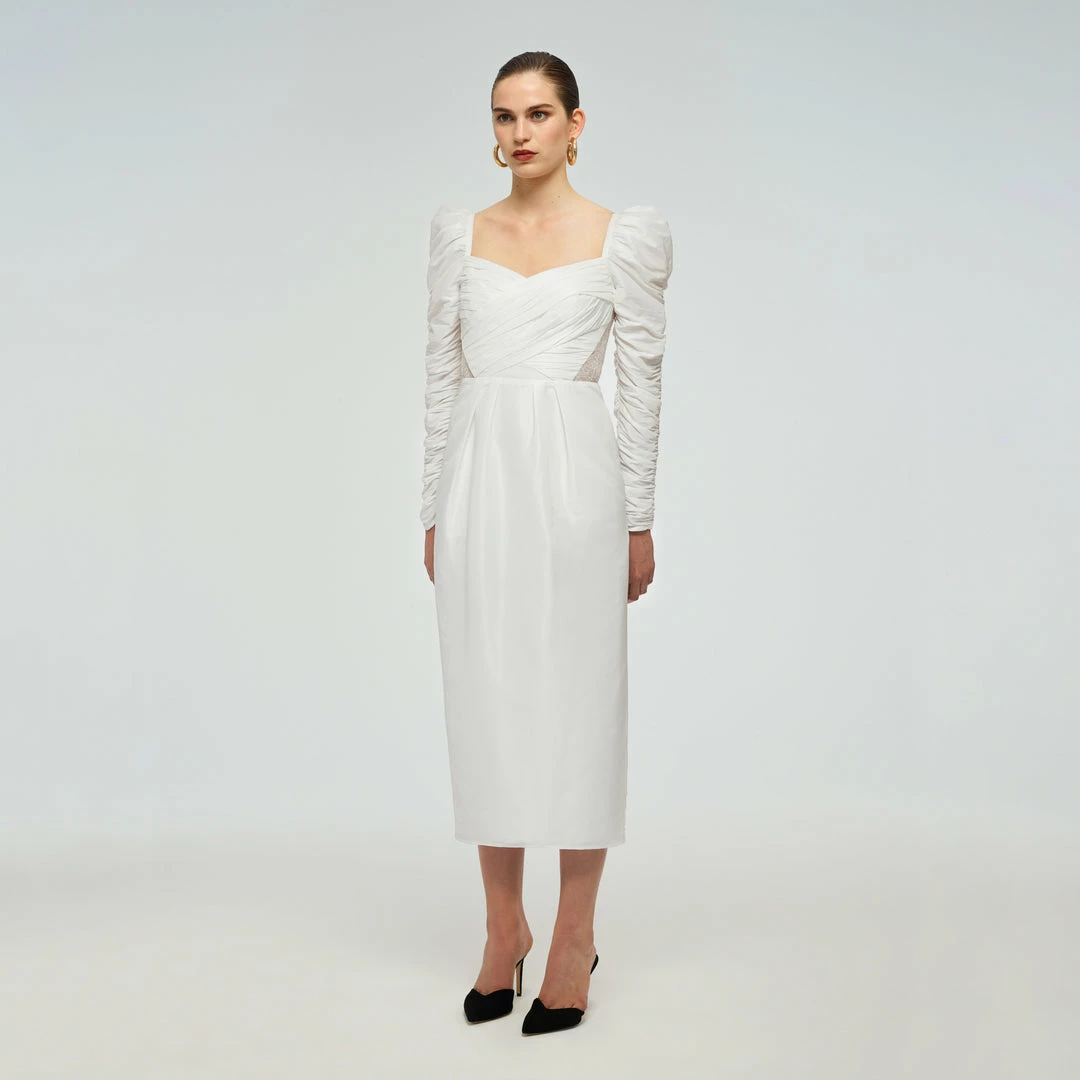 This midi dress is cut from white taffeta and fine lace. It is designed with subtle puff sleeves and a wrap bodice detail. The back and side inserts are panelled with fine lace. The skirt is pleated at the waist and falls to a fitted midi. This style is lined. Check the Size Guide to find your perfect fit.