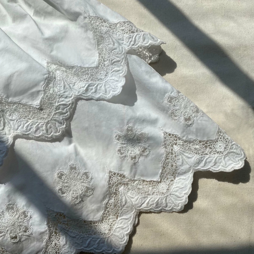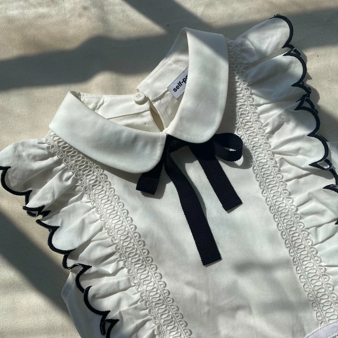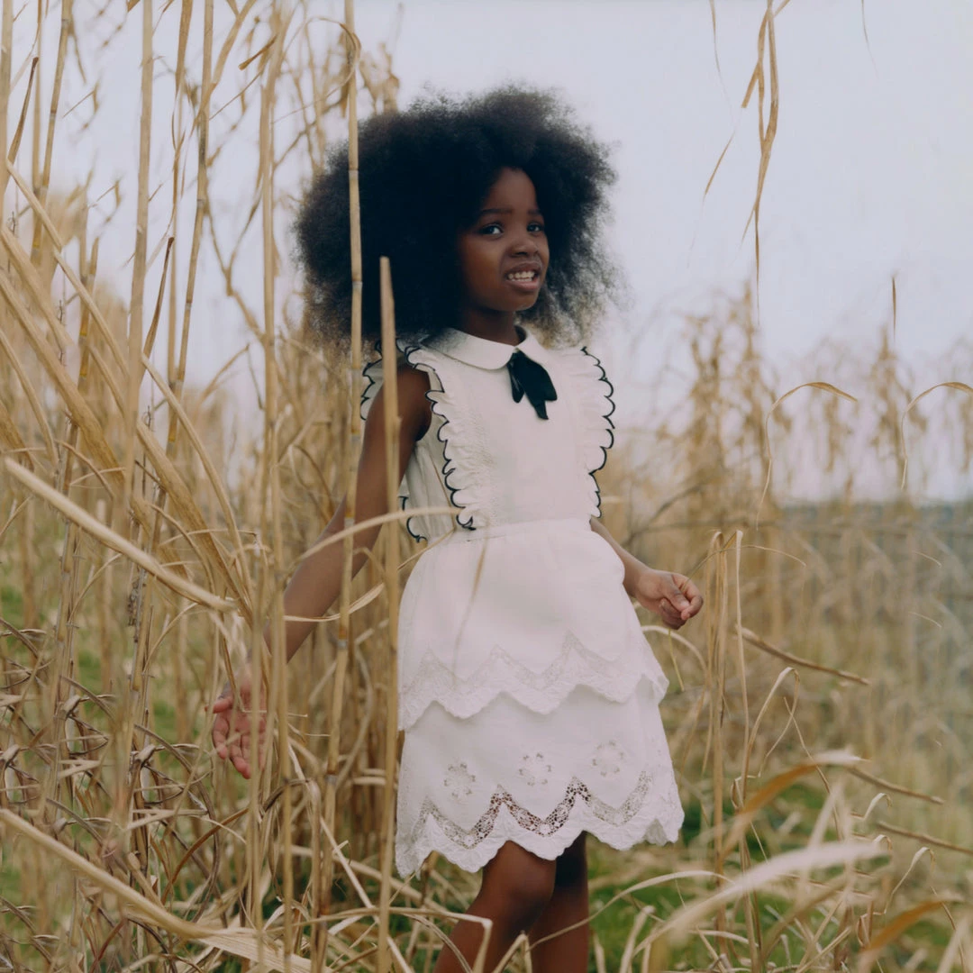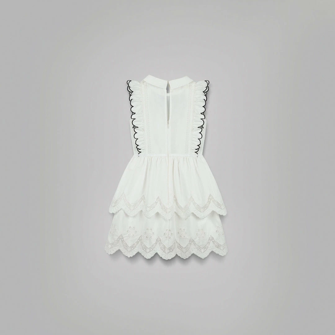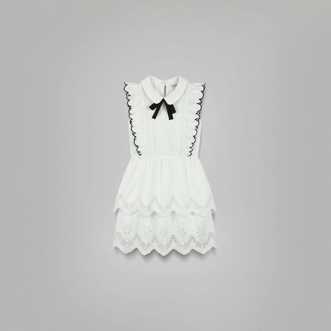 This kids mini dress is cut from white cotton poplin. The front bodice is framed with frill sleeves and features a peter pan collar and removable contrast bow at the neck. The tiered skirt is crafted with embroidery at the hem and is finished with a scalloped edge. Check the Size Guide to find your perfect fit.